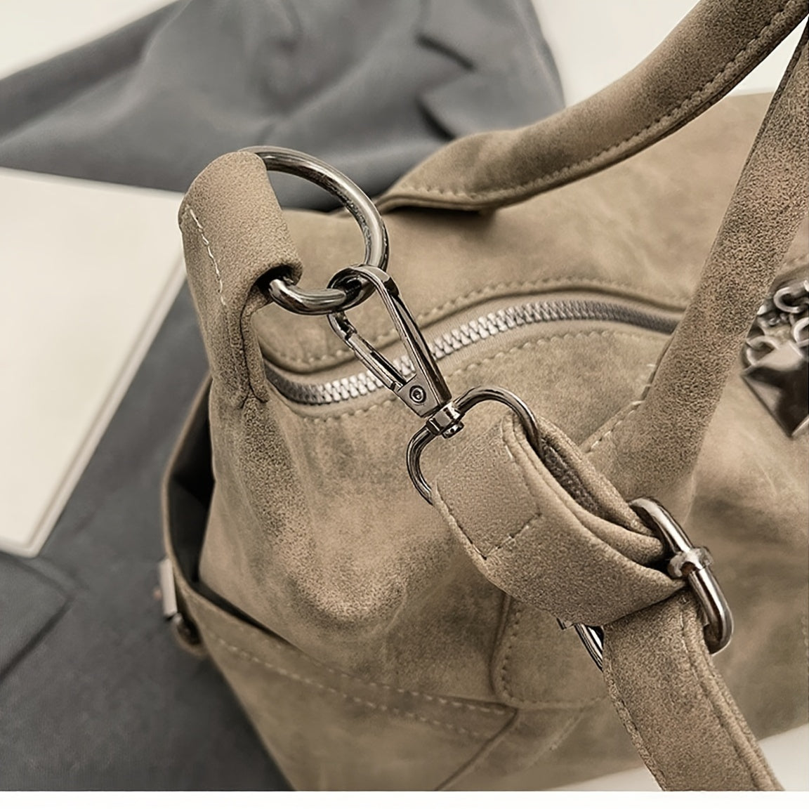 Brown suede handbag held by a person wearing a black outfit.