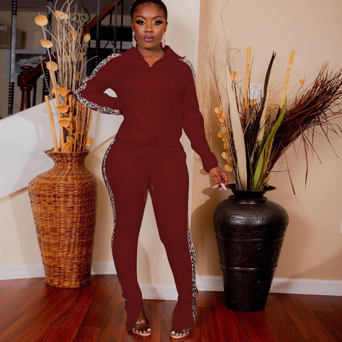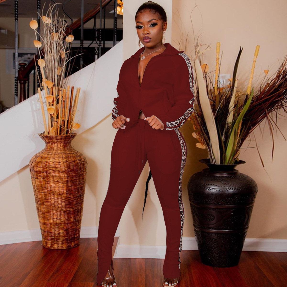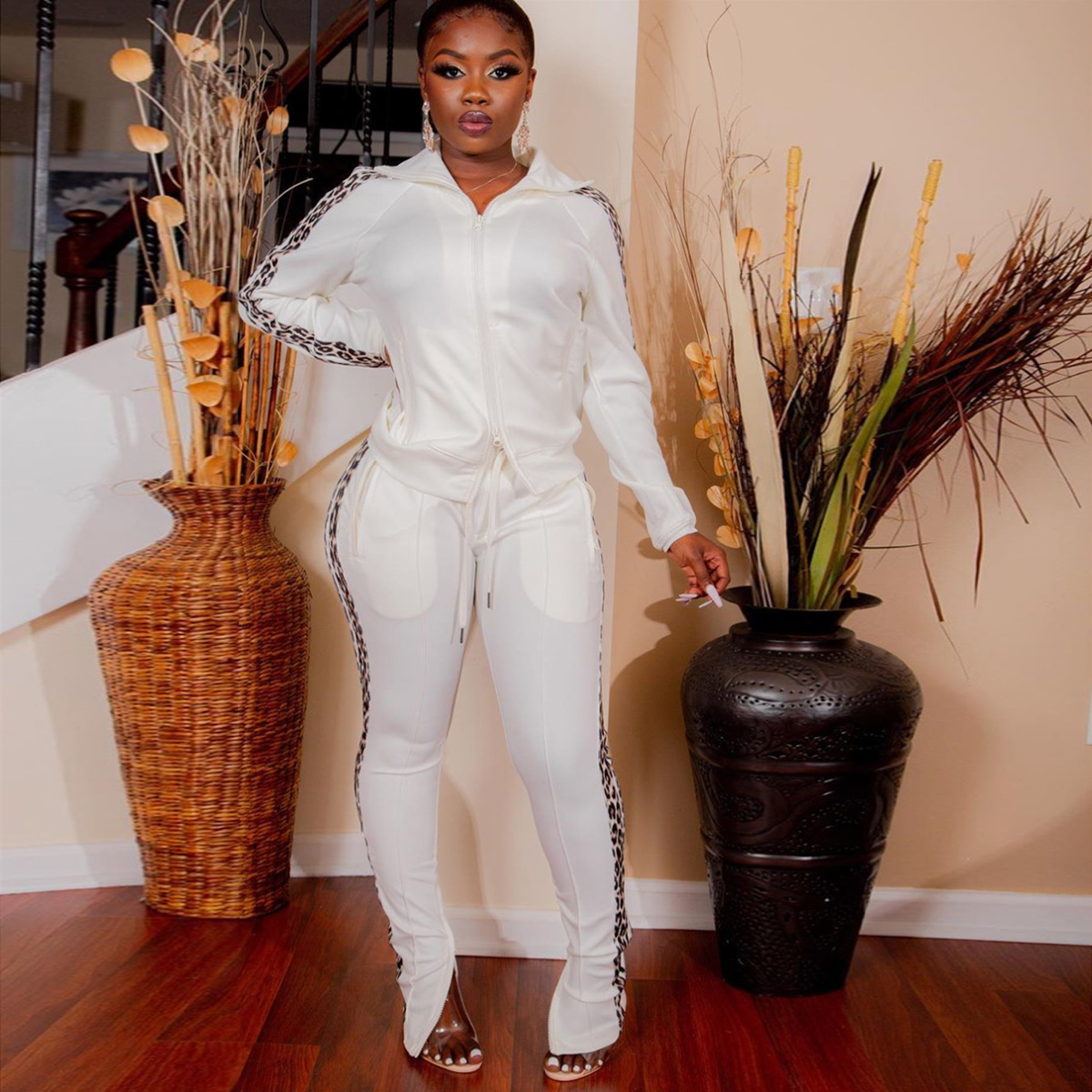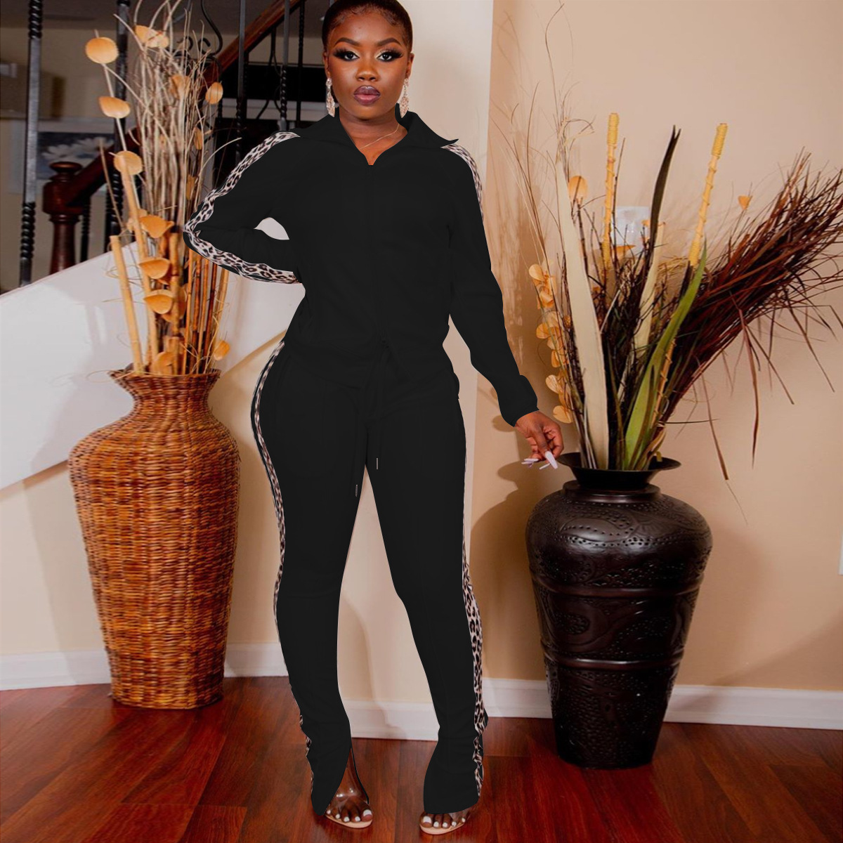 Just Hot Sexy 2Pcs Cotton Blend Lepard Strip Women's Tracksuits in Plus Sizes