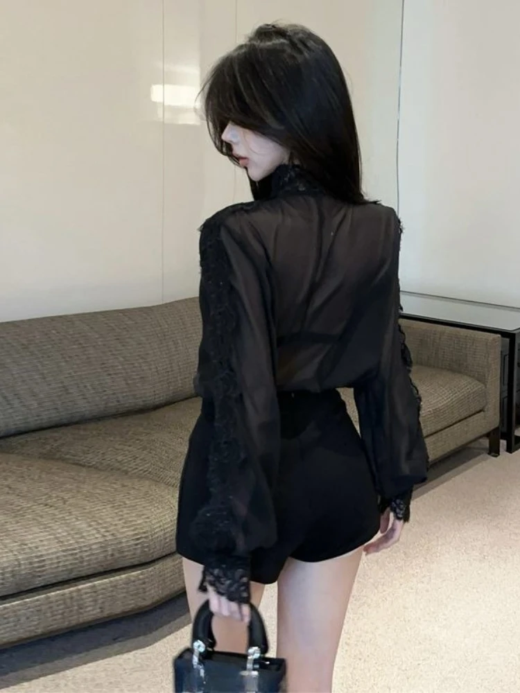 Camisas de encaje floral transparente 👚 Estilo sexy con escote en V abierto
