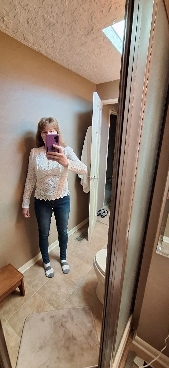 paborito ko sa lahat ng panahon! Medium ang orihinal na binili ko at ok lang sana kung naka-under jacket ako, but by itself was a little snug. sobrang lambot ng lace. bumili ng size na mas malaki maliban na lang kung may tumba kang abs. ang isa ay hinugasan at pinatuyo ng mabuti sa mga makina. walang pag-urong sa malamig na tubig at regular na dry cycle. Ako ay 5'7, 140# na may maikling katawan