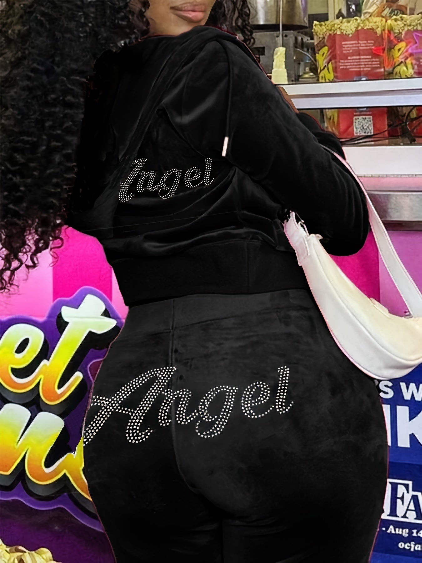 Rhinestone Anglel Print Hooded Velvet Tracksuits - Flossy Mom