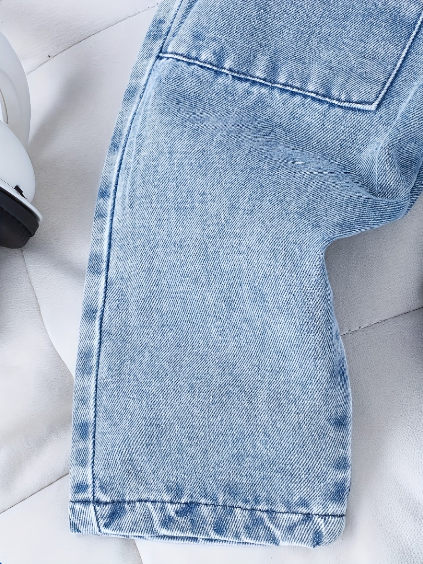 Children's denim jacket and pants set on a white surface with a newspaper and sign in the background.