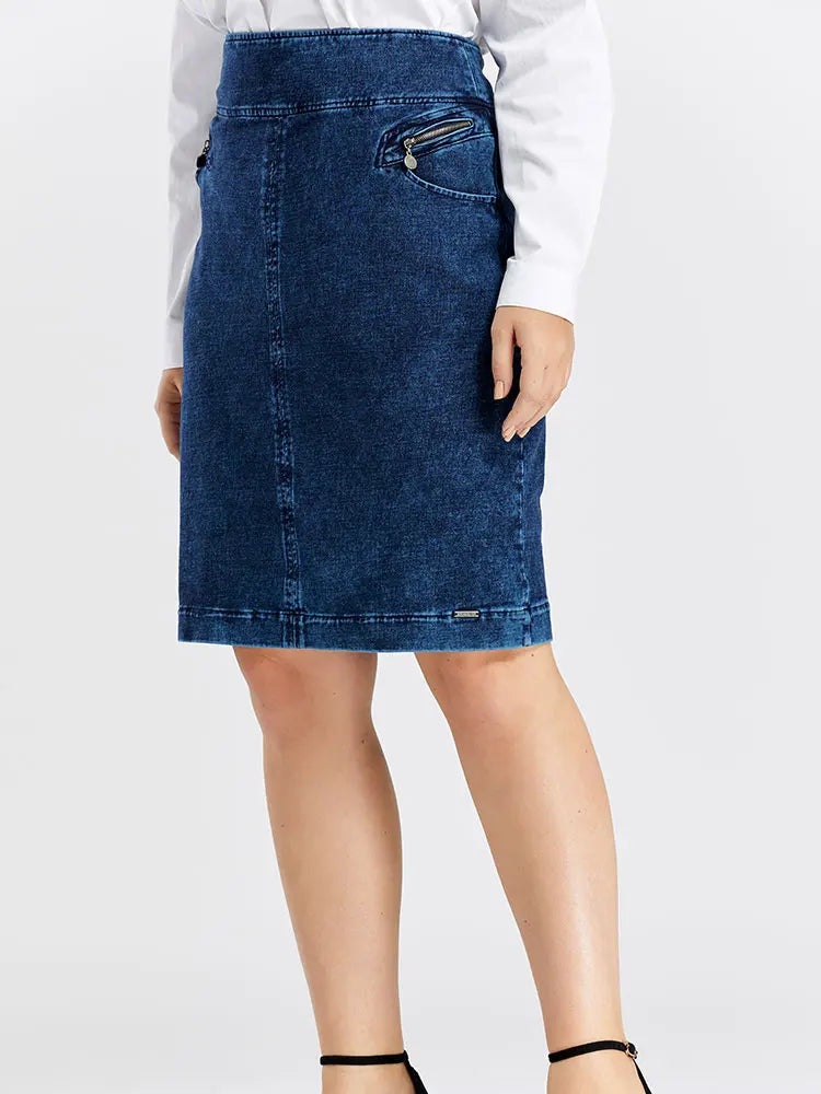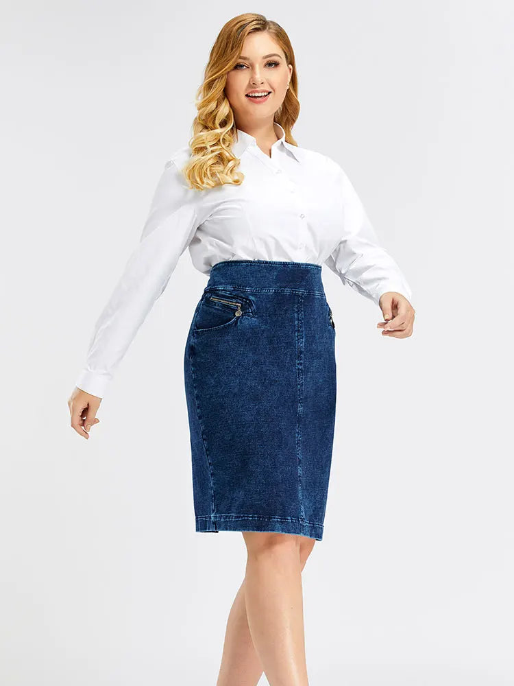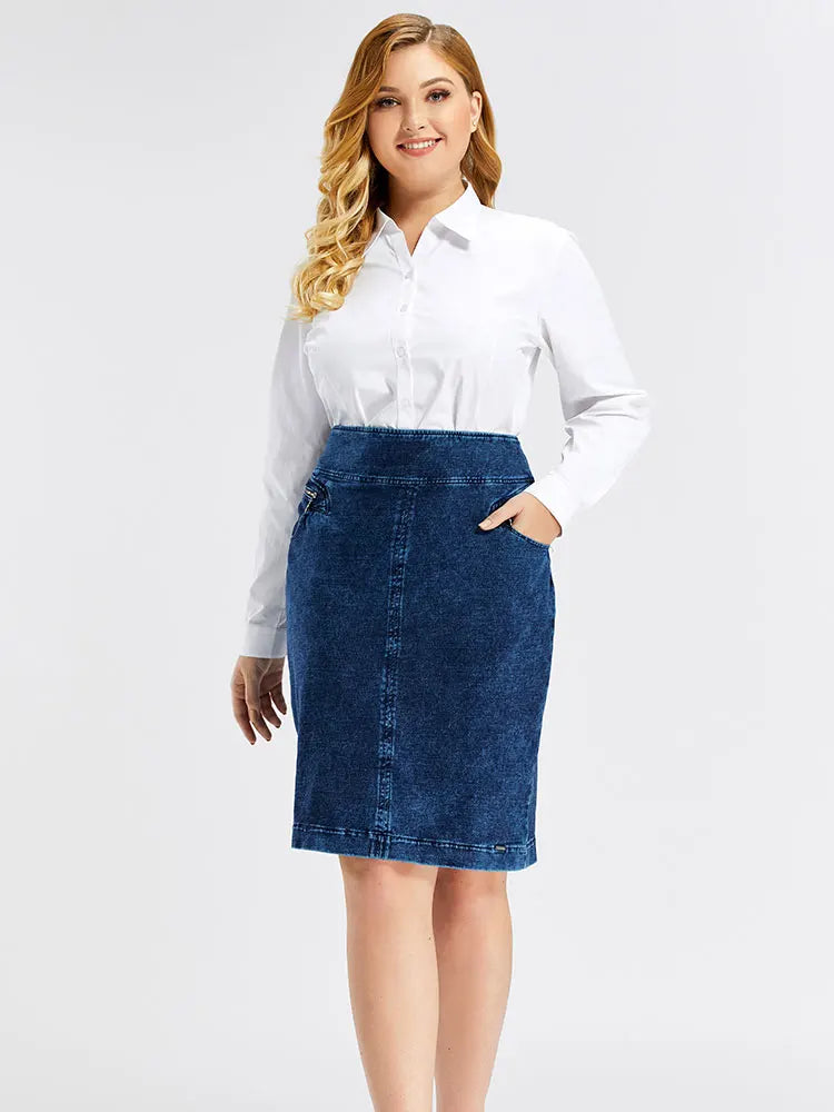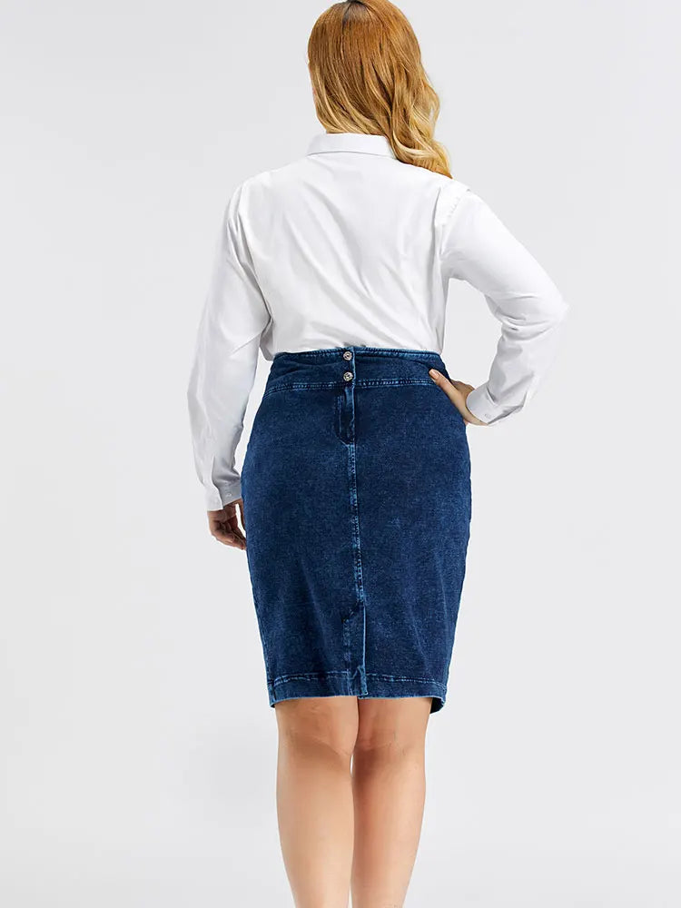 Step out in timeless style with our Vintage High Waist Knee-Length Flared Denim Skirt, designed exclusively for plus size women. Featuring a flattering high waist that enhances your curves, this skirt flares gently for a feminine silhouette and hits right at the knee for versatile wear. The classic button-front detail adds a charming vintage touch, making it perfect for casual days or dressing up with your favorite blouse and heels.